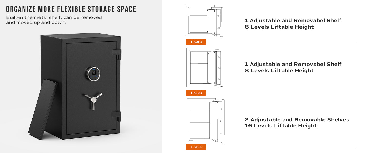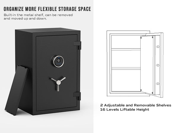 PACKAGING | 1 x Fireproof Safe | 2 x Backup Keys | 1 x Expansion Bolt | 2 x Adjustable Shelves | 1 x Handle Spoke Kit | 1 x Instruction Manual