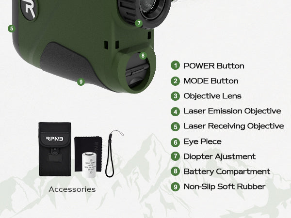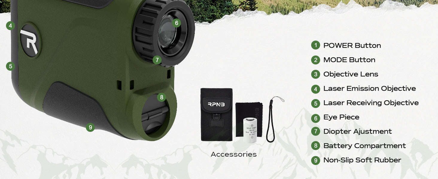 PACKAGING | 1 x Laser Rangefinder; 1 x Soft Case; 1 x Lens Cleaning Wipe; 1 x Wrist Lanyard; 1 x CR-2 Lithium Battery; 1 x Instruction Manual