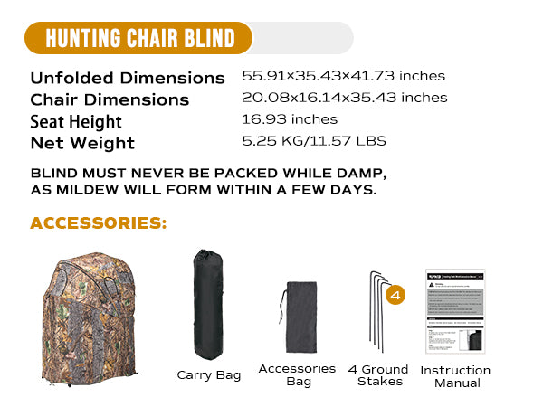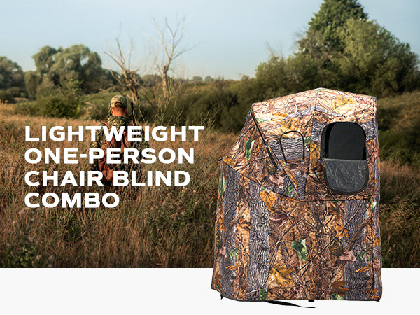 Each hunting chair blind combo has a maximum load capacity of 250lbs, but is lightweight at only 11.57lbs. Each hunting chair blind comes ready to use out of the bag, it is not assembled. Pop-up construction makes it easy to set up and take down. Get up and running quickly. Includes sturdy ground stakes to withstand strong winds