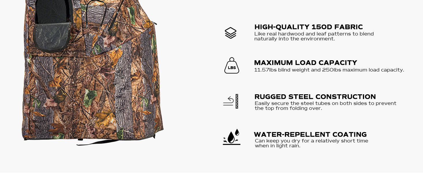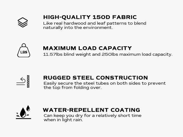 Our hunting blind features a sturdy steel construction to enhance its stability and durability. High-quality 150D fabric materials with water-repellent coating. Ensure the blinds withstand the most inclement weather conditions, such as rain, snow, and winds. Can keep you dry for a relatively short time when in light rain