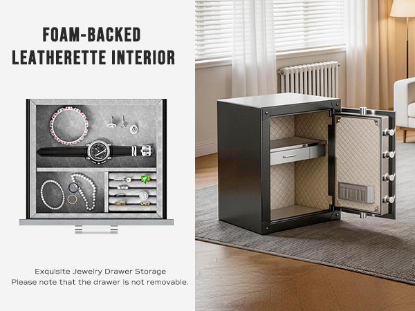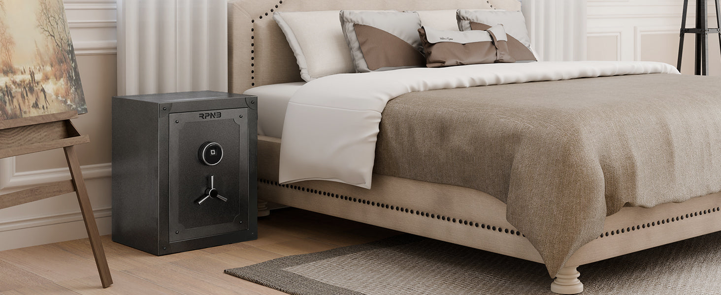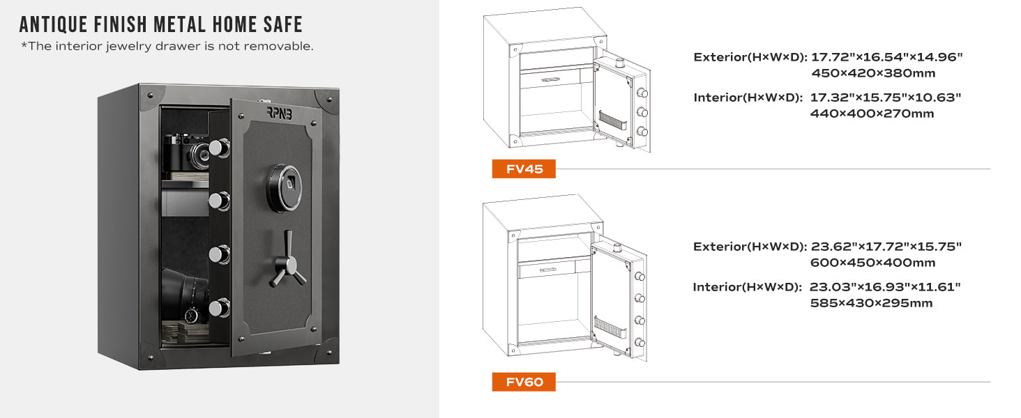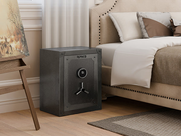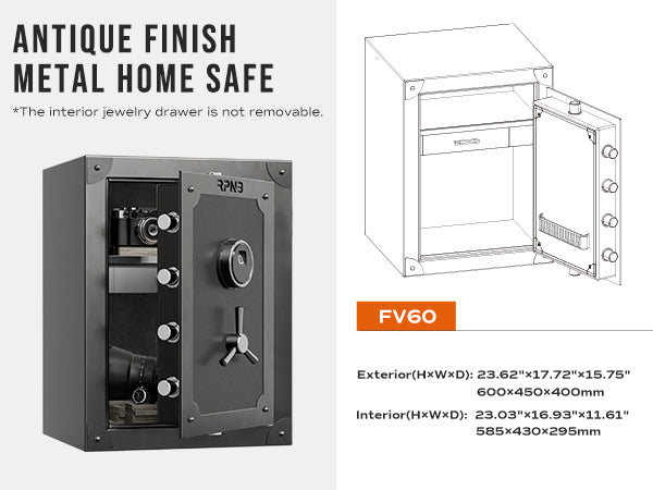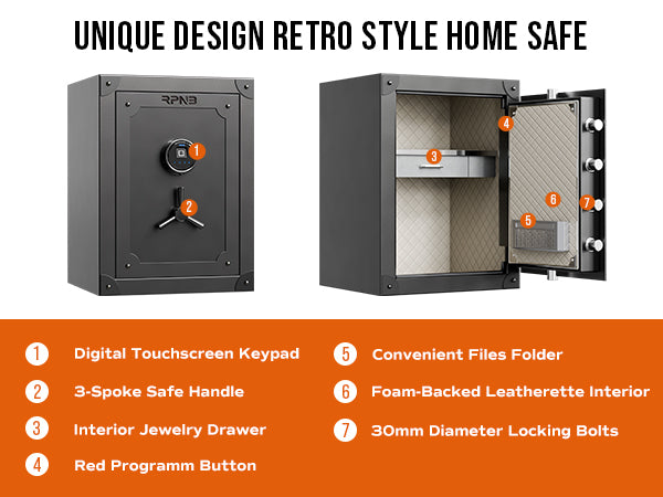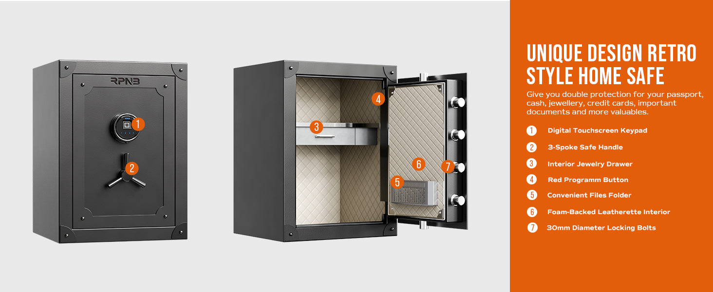 RPNB home safes are made of anti-theft solid steel, heavier than 90 lbs, have a powder-coated vintage finish to prevent corrosion. Equipped with 6mm pry-resistant thick doors, 3-way 30mm diameter locking bolts, and sturdy anti-impact hinges. A large volume of 2.62 cubic feet with interior dimensions of 23.03 ×16.93 ×11.61 inches (H*W*D). Ensure that your valuables are safe and secure in your home or office
