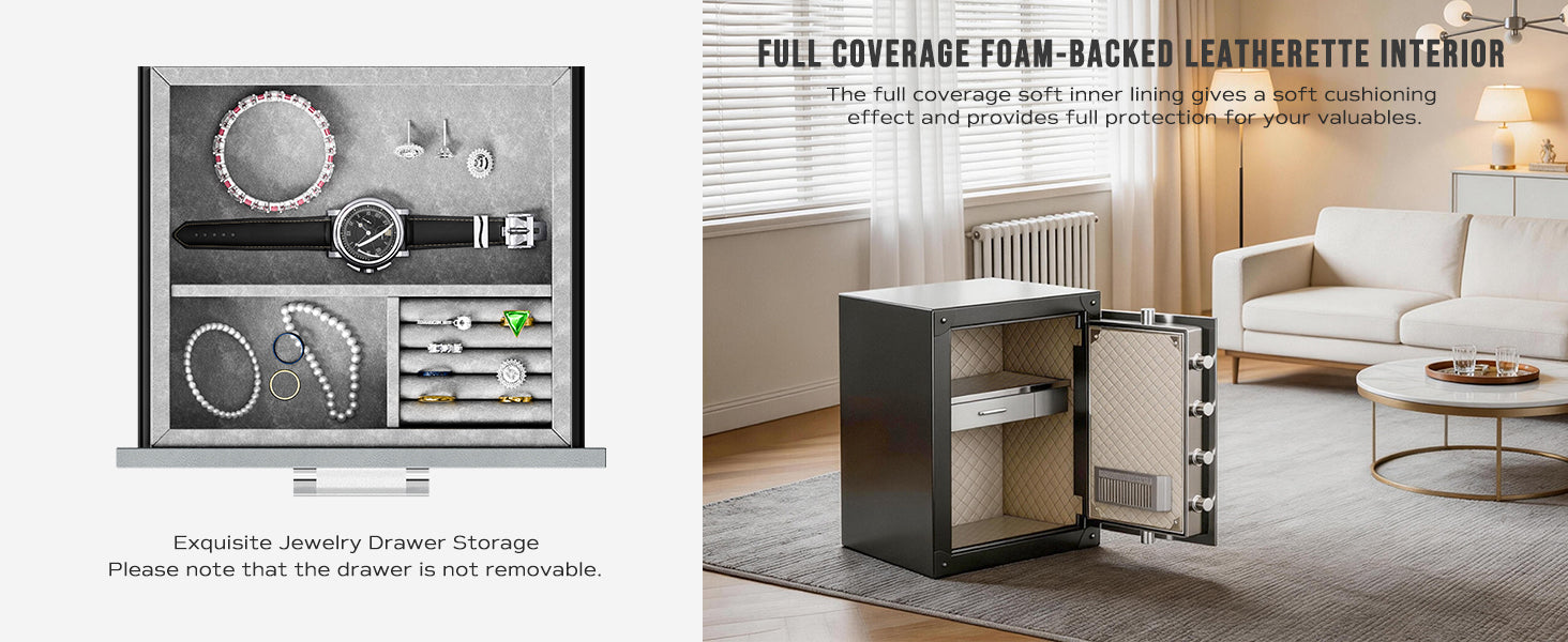 A built-in jewelry drawer is covered by durable PU leather, and the inner is made of soft velvet lining to protect your precious jewelry away from dust, abrasion, scratches and other damages. The rails of the drawer operate smoothly and silently, and the ring compartment can be removed if needed